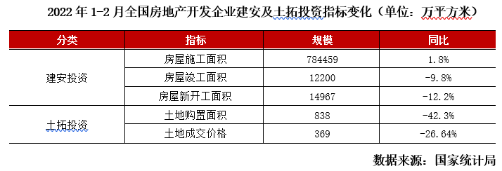 2022年一季度行業(yè)繼續(xù)調(diào)整,前2月銷售和投資同比增速均為近6年次低,全國(guó)商品房銷售面積、金額分別同比下降10%和19%,銷售均價(jià)同比下降11%。土地購(gòu)置面積和房屋新開工、竣工面積分別同比下降42%、12%和10%,僅房屋施工面積微增2%,受此影響下開發(fā)投資額僅同比微增4%。