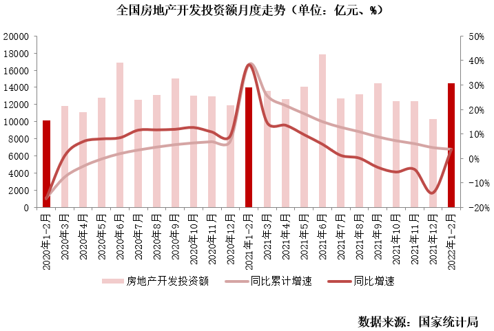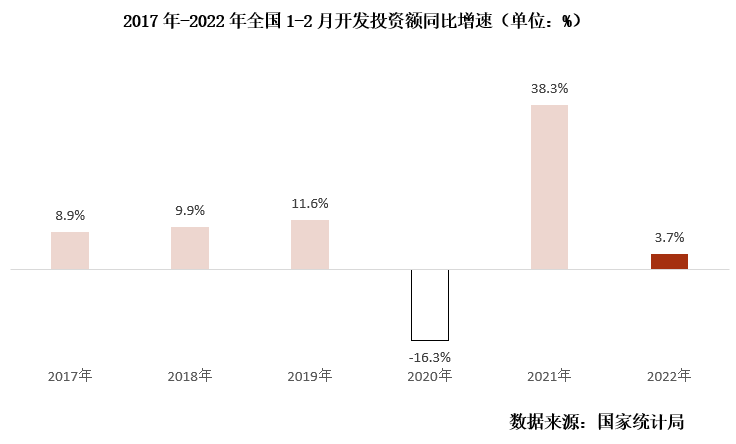 據(jù)國(guó)家統(tǒng)計(jì)局?jǐn)?shù)據(jù):1—2月,全國(guó)房地產(chǎn)開發(fā)投資14499億元,同比增長(zhǎng)3.7%。對(duì)比往年同期來(lái)看為近6年次低,僅高于2020年。