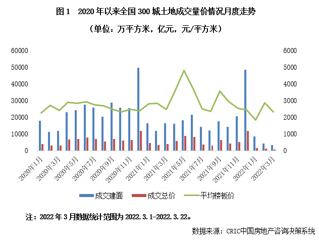 成交規(guī)模跌入谷底,同比降幅高達(dá)六成。一季度,全國(guó)300城經(jīng)營(yíng)性土地成交建筑面積僅15771萬(wàn)平方米,環(huán)比跌幅高達(dá)81%,同比來(lái)看,受集中供地階段性“低谷”和市場(chǎng)下行的影響,同比降幅高達(dá)60%。分月來(lái)看,在供地節(jié)奏變化及多地疫情反彈的影響下,1-3月的土地成交量均明顯不及去年同期,一季度土地成交規(guī)模也因此跌入谷底。