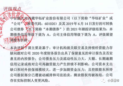 近日,中證鵬元公告稱,將華鈺礦業(yè)(601020.SH)主體信用等級(jí)由AA-下調(diào)至A,“華鈺轉(zhuǎn)債”信用等級(jí)由AA-下調(diào)至A,評(píng)級(jí)展望由“穩(wěn)定”調(diào)整為“負(fù)面”。