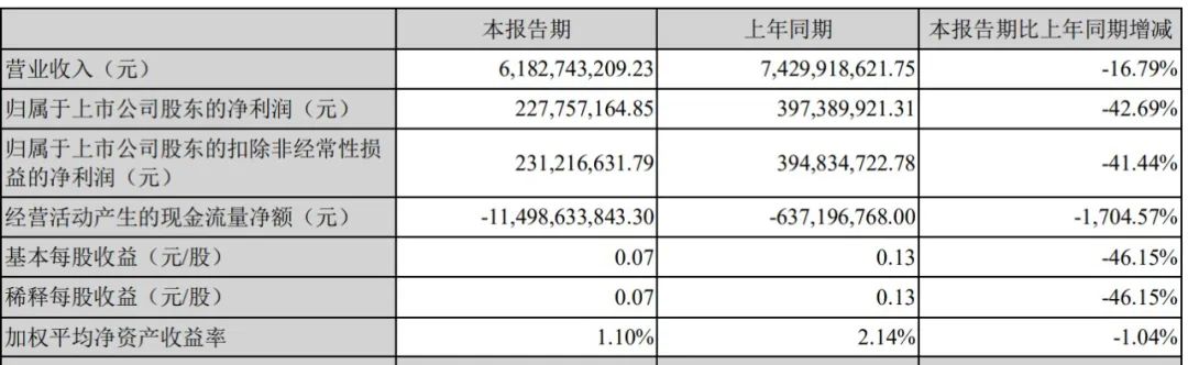 和2021年數(shù)據(jù)正相反,2022年1季度濱江集團(tuán)的營收和凈利潤同比均呈下跌狀態(tài)。如下圖,營收同比下降16.79%,為61.83億元;歸屬于上市公司股東的凈利潤同比下降42.69%,為2.28億元。經(jīng)營活動產(chǎn)生的現(xiàn)金流量凈額同比大跌1704.57%,為-115.0億元。