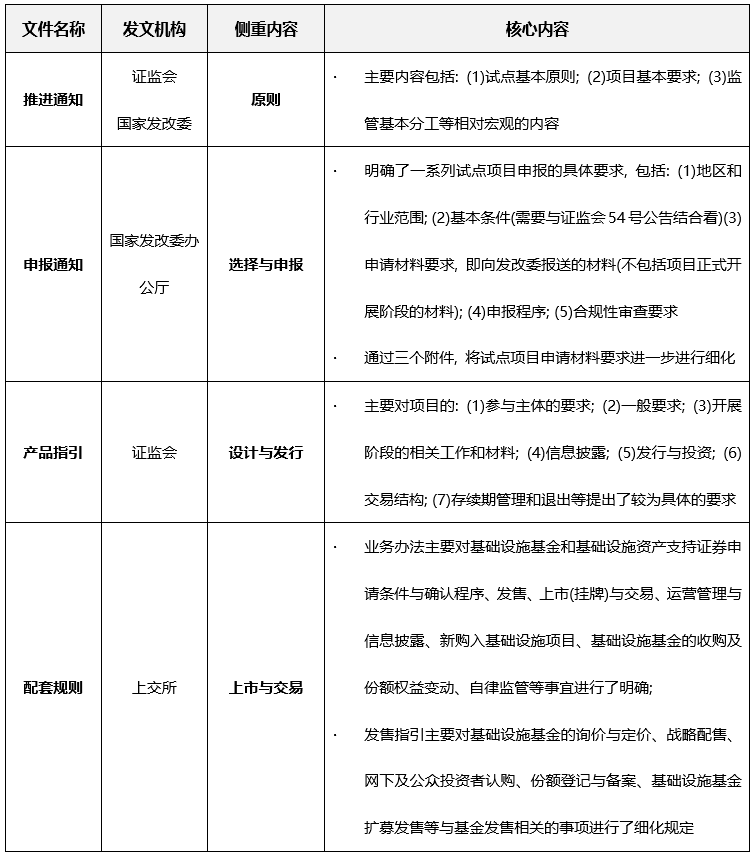 結合此前已經頒布的包括《關于推進基礎設施領域不動產投資信托基金(REITs)試點相關工作的通知》(“40號通知”或“推進通知”)、《關于做好基礎設施領域不動產投資信托基金(REITs)試點項目申報工作的通知》(“586號文”或“申報通知”)、《公開募集基礎設施證券投資基金指引(試行)》(“54號公告”或“產品指引”), 我們認為, 配套規則和上述規范性文件, 具有清晰的層次和明確的分工, 分別從原則、選擇與申報、設計與發行、上市與交易的角度, 共同完善并構成了公募REITs業務的規則體系。