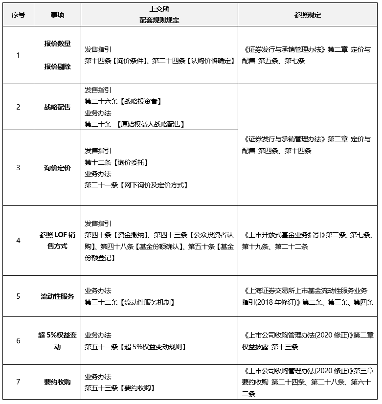 從思路來看, 配套規則總體采取了“比照股性規則, 搭建獨立體系”的總體立法思路。在業務辦法中, 比照了公開發行證券要求建立掛牌和上市審查制度, 但在全流程重要節點和關鍵環節規范與權責分配的角度, 保留了REITs產品的特殊性特色。在發售指引中, 借鑒了股票定價和LOF基金發售, 對公募REITs的詢價和定價進行了規范, 但同時在投資者報價個數要求、報價剔除、戰略配售機制等方面充分結合產品屬性特征, 作出了區別股票的特有安排。