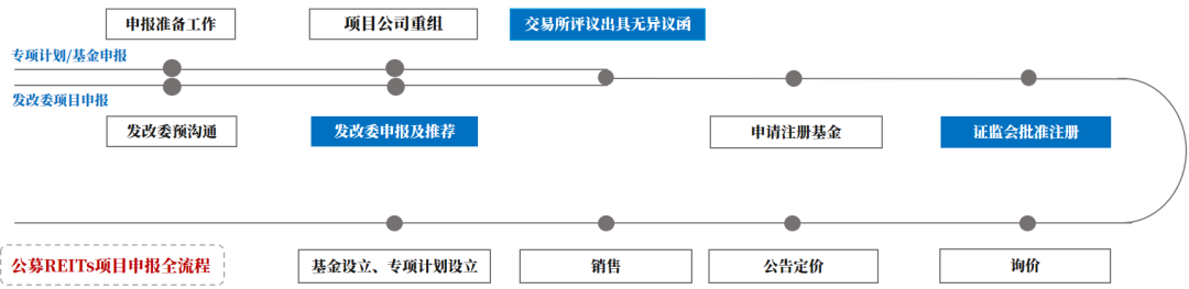 其一, 公募RETIs作為公募基金和資產支持證券相結合的產品, 上交所借鑒了此前對資產支持證券的管理經驗, 結合公開證券發行的要求, 細化了對基礎設施資產支持證券的掛牌及基金上市的申請條件、協同盡調、申請文件等方面的要求, 同時明確了材料受理、審核與反饋所需時間。我們對公募REITs的申報全流程及上交所基本審核程序的梳理如下圖所示: