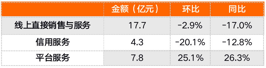 根據(jù)財(cái)報(bào),三季度樂(lè)信的電商業(yè)務(wù)GMV為12.8億元,同比下降3.3%,而二季度的GMV為15億元,所以三季度環(huán)比下降了14.7%;線上直接銷(xiāo)售與服務(wù)收入17.7億元,同比減少17%,環(huán)比減少2.9%。