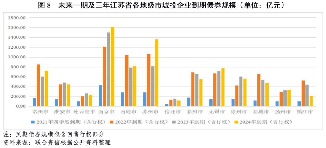 江蘇省未來三年內債券到期分布較均勻,2022年到期債券城投企業以區縣及園區級為主,主體級別以高等級為主;其中南京市、南通市及蘇州市債券到期規模較大,鎮江、宿遷、連云港及淮安市到期城投債券行政層級以市級為主,宿遷市、徐州市和揚州市低級別城投企業存續債到期規模占其債券總額比重較高。