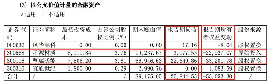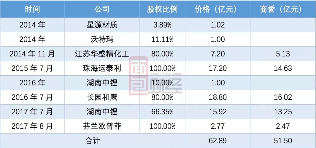 2014年,公司圍繞電動汽車相關(guān)材料方面,相繼投資深圳市星源材質(zhì)科技股份有限公司(星源材質(zhì),300568.SZ,2016年12月上市)、收購江蘇華盛精化工股份有限公司80%股權(quán)、增資獲得深圳市沃特瑪電池有限公司11.11%股權(quán)。