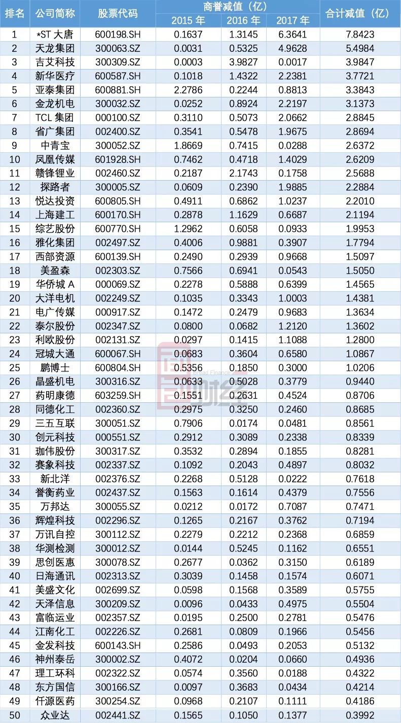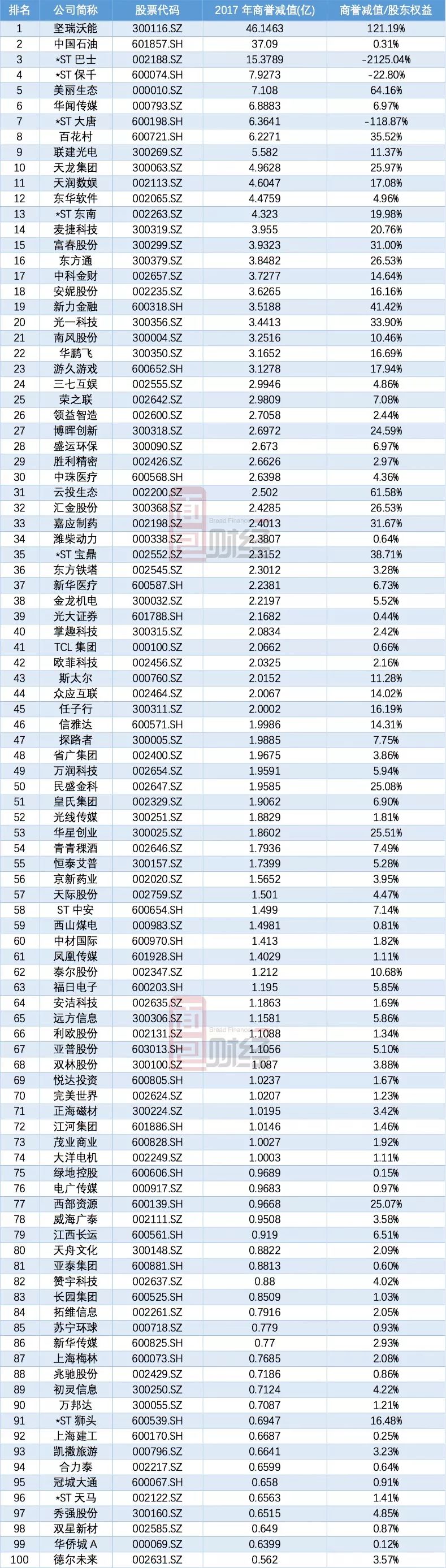 以下是2017年商譽(yù)減值金額排名前100的公司名單: