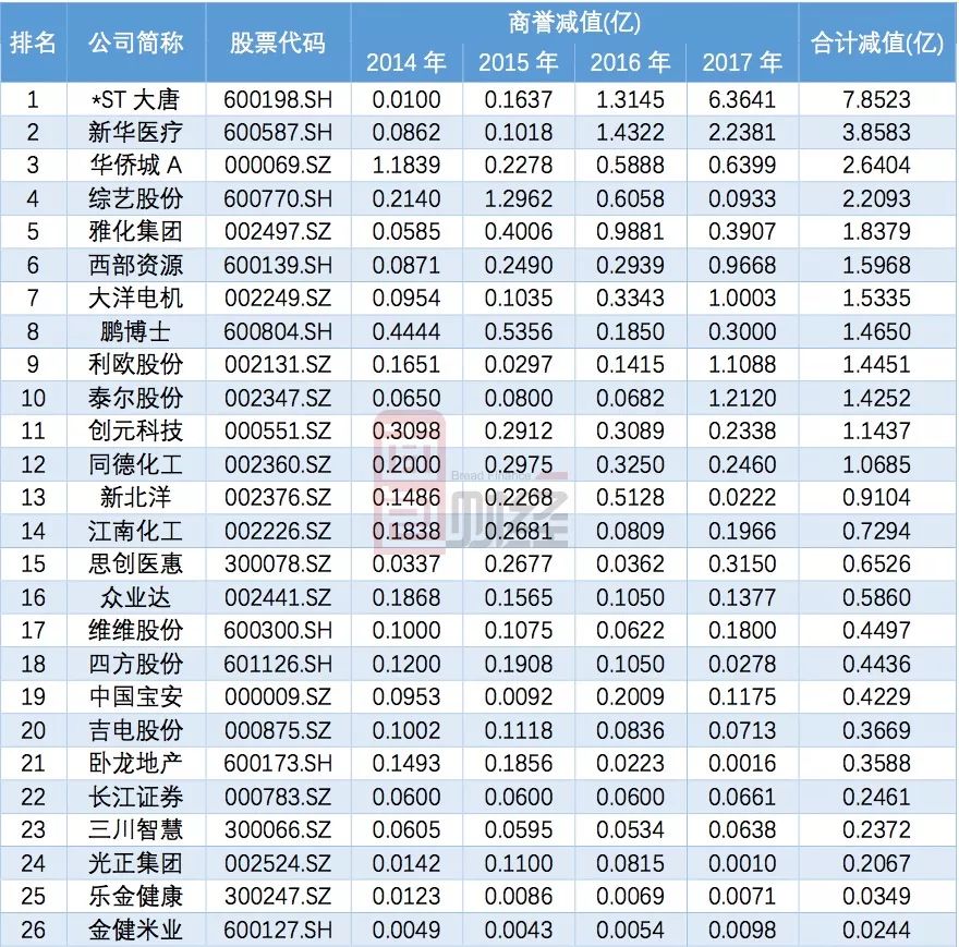 更有26家公司2014至2017年,連續(xù)四年商譽(yù)減值,名單如下: