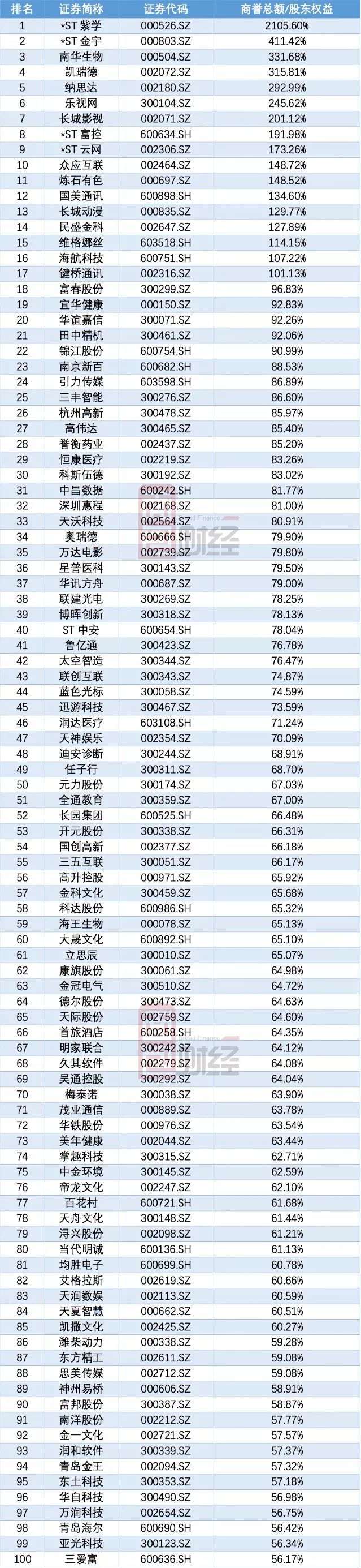 按照商譽(yù)占?xì)w屬于母公司股東權(quán)益和資產(chǎn)總額占比,排名前100名如下: