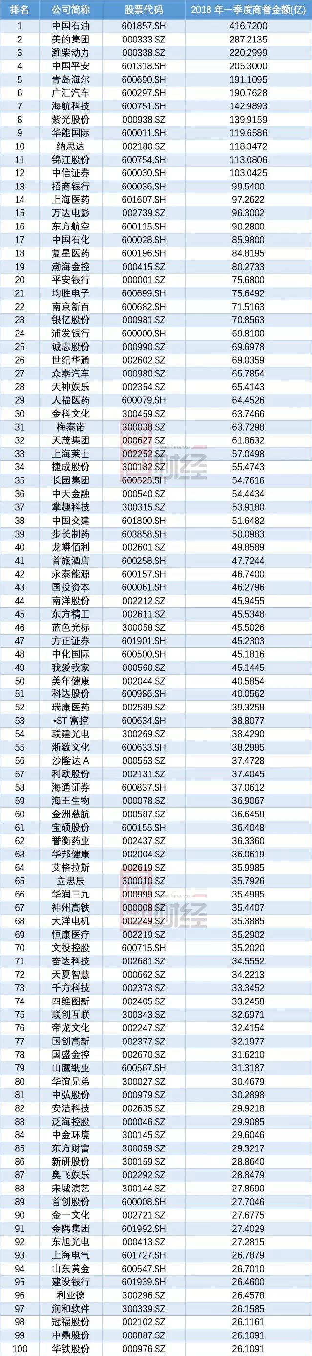 截止2018年一季度末,A股有1945家公司賬面上有商譽(yù),總額13,403.77億元,較上年增加2042億元。商譽(yù)總額前100名排名如下: