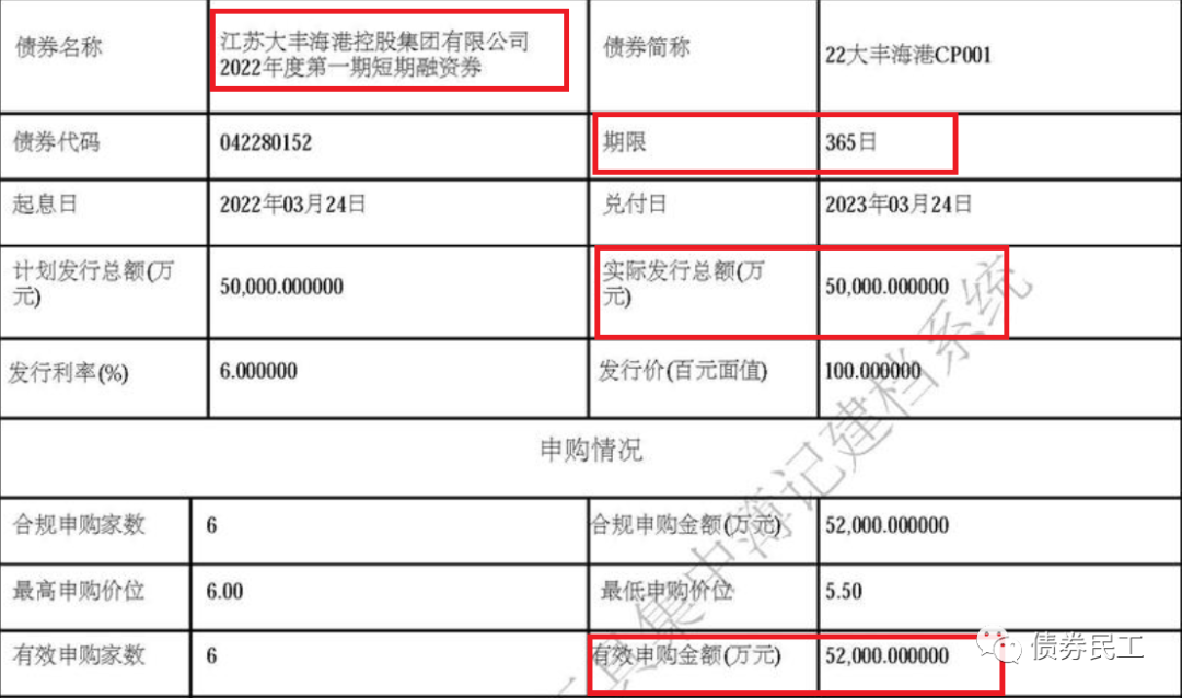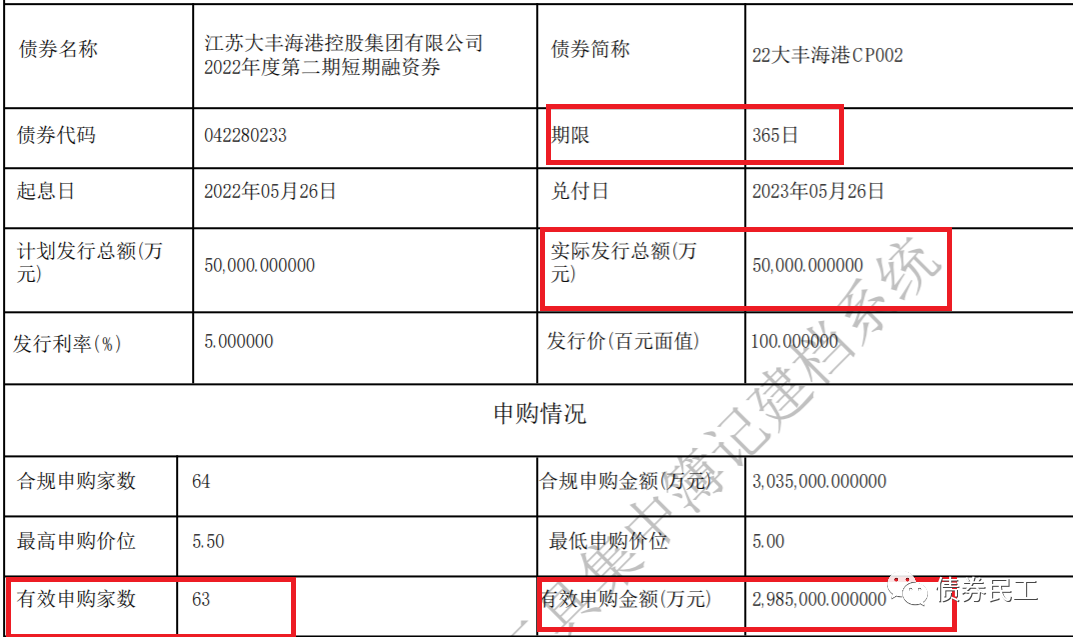 2022年5月25日,江蘇大豐海港控股集團(tuán)有限公司(以下簡(jiǎn)稱“大豐控股”)發(fā)行2022年度第二期短期融資券,發(fā)行金額為5億元,有效申購(gòu)金額為298.50億元,申購(gòu)倍數(shù)高達(dá)59.7倍?。。∵@個(gè)申購(gòu)倍數(shù),是債券民工見過的最高的,之前只見過10倍的。“22大豐海港CP002”的債券期限為1年,最終發(fā)行利率為5.0%。