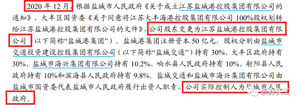 大豐控股的原股東和實(shí)際控制人為大豐區(qū)國(guó)資委。2020年12月,大豐控股的實(shí)際控制法人由大豐區(qū)國(guó)資委更為江蘇鹽城港控股集團(tuán)有限公司,實(shí)際控制人由大豐區(qū)國(guó)資委變更為鹽城市人民政府。