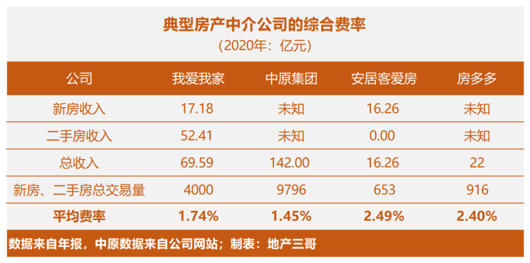 我愛我家、中原集團等未公開新房和二手房具體的交易量,我們僅能推斷其整體的收費率: