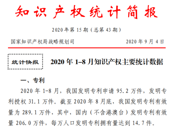 2020年1-8月,我國發明專利申請95.2萬件,發明專利授權31.1 萬件。截至2020年8月底,我國發明專利有效量為289.1萬件,其中,國內(不含港澳臺)發明專利有效量206.0萬件,每萬人口發明專利擁有量達到14.7件。