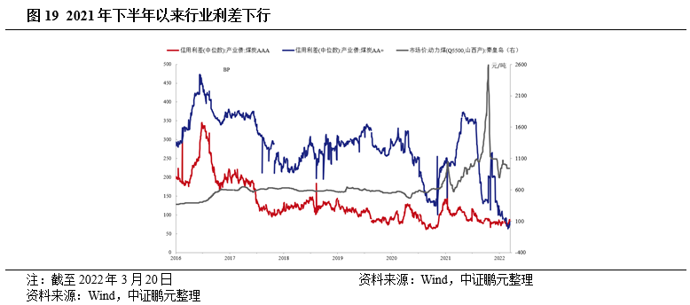 煤價行情過熱下,行業信用利差下行。供給側改革以來,煤炭行業供給結構改善,作為行業發債主體的大型煤企在本輪改革中充分受益,資源稟賦集中度上升,盈利能力大幅改善,行業信用利差2016年下半年之后整體呈波動下行的趨勢。2020年11月永煤控股違約事件之后,行業信用利差快速上行,其中AA+煤企信用利差走闊較為明顯,2021年下半年以來煤價快速上行,煤企信用利差快速收斂,反映出行業信用風險在高景氣度下邊際改善隨著煤炭價格趨穩,同時近期發改委上調長協基準價格等政策利好,弱資質煤企信用利差再度回落,整體來看呈現對價格變動更加敏感的特征。截至2022年3月,煤炭行業利差下行至數年來年低位。