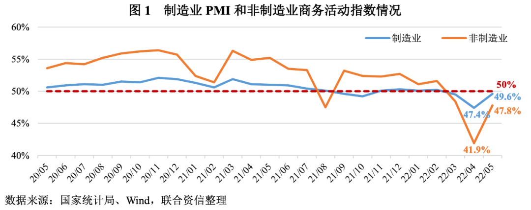 2022年5月,中國制造業采購經理指數(PMI)、非制造業商務活動指數和綜合PMI產出指數分別為49.6%、47.8%和48.4%,均低于臨界點,但較上月分別回升2.2個、5.9個和5.7個百分點。主流觀點認為,雖然三大指數均在臨界點以下,但環比明顯回升,表明“近期疫情形勢和國際局勢變化等因素對經濟運行造成較大沖擊,但隨著高效統籌疫情防控和經濟社會發展成效顯現,我國經濟景氣水平較4月份有所改善”。根據國家統計局PMI指數的調查和計算方法,5月數據顯示中國經濟繼續處于收縮區間,所謂的“改善”,指的是5月經濟收縮的幅度較4月大幅減小,而非總體狀況有所好轉。聯合資信認為,5月數據說明中國制造業出現探底企穩跡象,而服務業繼續維持收縮態勢。未來,隨著疫情得到全面控制,生產生活進入常態化,穩增長的一攬子政策措施效應逐步顯現,中國經濟將重返擴張區間,保持合理增長。