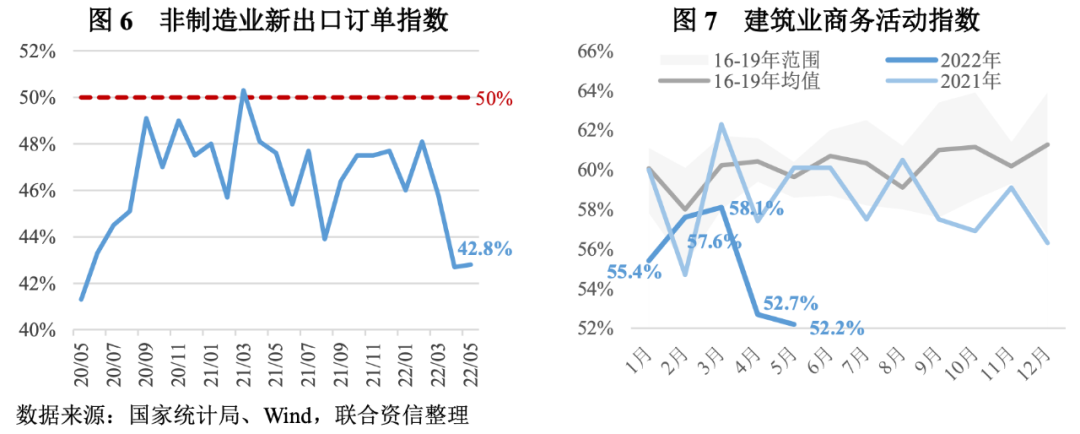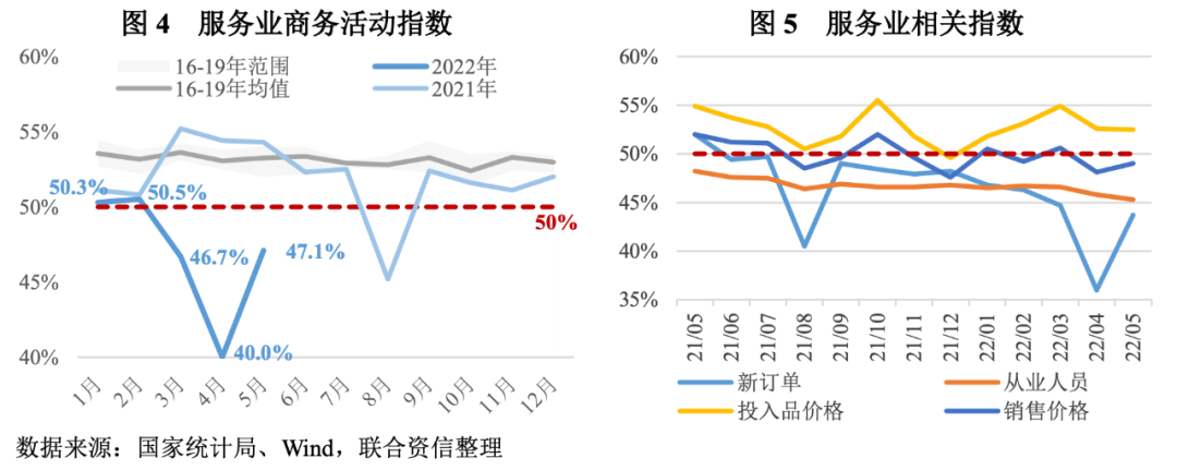 進一步觀察5月制造業PMI、非制造業商務活動指數相關分項指標,可以看到部分指標仍處于顯著收縮狀態,反映出相關行業經營狀況依然較差。
