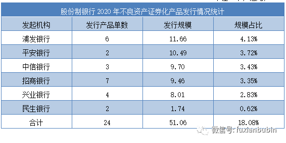 2020年股份制銀行資產(chǎn)承壓,不良資產(chǎn)化解需求較大,因此不良資產(chǎn)證券化發(fā)行產(chǎn)品較多。其中以浦發(fā)銀行發(fā)行產(chǎn)品單數(shù)最多,規(guī)模最大。而民生銀行發(fā)行發(fā)行規(guī)模最小。整體而言,股份制銀行不良資產(chǎn)證券化產(chǎn)品發(fā)行規(guī)模處于第二梯隊(duì):