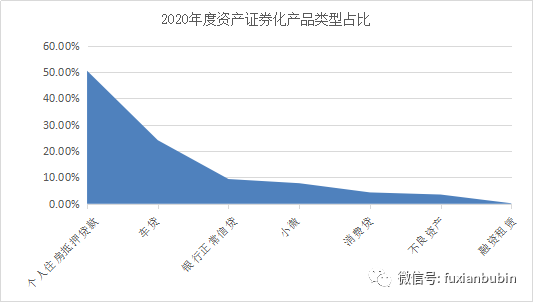 2020年度,信貸資產(chǎn)證券化產(chǎn)品一共發(fā)行184單,規(guī)模共計(jì)8041.90億元,其中,以個(gè)人住房抵押貸款、車貸、銀行正常信貸、小微、消費(fèi)貸、融資租賃為底層資產(chǎn)的資產(chǎn)證券化產(chǎn)品占比分別為50.49%、24.13%、9.38%、7.80%、4.31%、0.19%,同比都有不同幅度的縮減,但不良資產(chǎn)證券化產(chǎn)品的市場份額則從1.49%提升至3.50%,在疫情影響下呈現(xiàn)大幅逆勢增長。