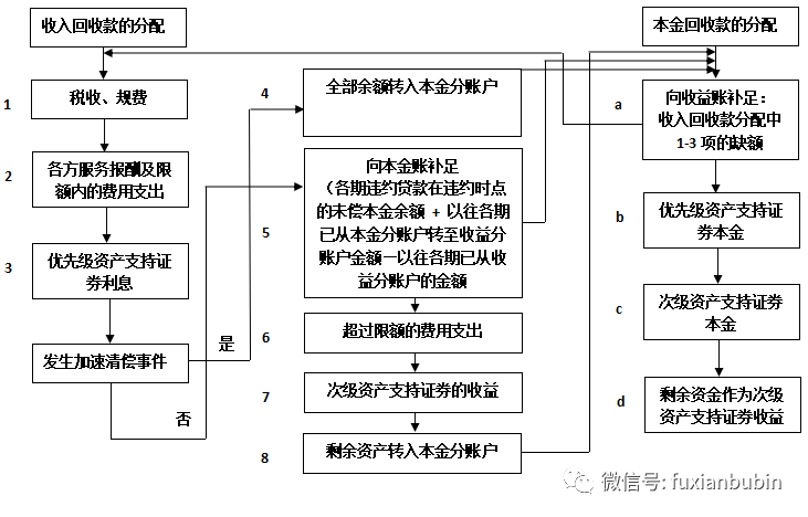 流動性問題是指現(xiàn)金流短期流動性不足。發(fā)生的原因在于當(dāng)期資產(chǎn)池現(xiàn)金流因資產(chǎn)池中產(chǎn)生的任何損失以外的事由而引發(fā)短缺,因而無法足額向資產(chǎn)支持證券的投資者兌付當(dāng)期本金和利息的問題。目前的不良資產(chǎn)證券化項(xiàng)目中,一般僅為當(dāng)期應(yīng)付的稅費(fèi)、高級費(fèi)用以及優(yōu)先級資產(chǎn)支持證券利息提供流動性支持。具體分配如下圖: