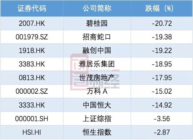 上周一,關于國開行收緊棚改融資的市場傳聞引發熱議,這也令滬深港三市的房企股價走勢雪上加霜?!芭锔摹逼鋵嵵皇侵袊康禺a政策的一個方面,但是卻觸動了房地產板塊敏感的神經。感受一下部分房企上周前四個交易日的跌幅: