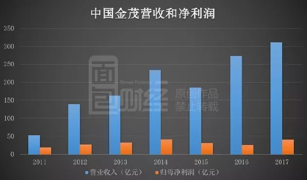 2017年,中國金茂總營收為310.75億元,同比增長14%;歸母凈利潤為39.78億元,同比增長57%;剔除物業重估收益后凈利潤為39.05億元,同比增長89%。