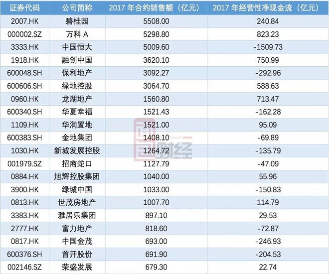 因此,對于負債率高企的房企來說,當前形勢下,加大回款才是王道。下表為面包財經整理的部分內資房企2017年合約銷售額和經營性凈現金流情況: