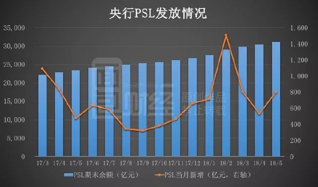 截至2018年5月末,PSL余額為3.12萬億元,5月新增801億元,單月新增金額不算低。2018年前5個月,PSL累計新增4371億元,單月增加金額基本都在700億以上。