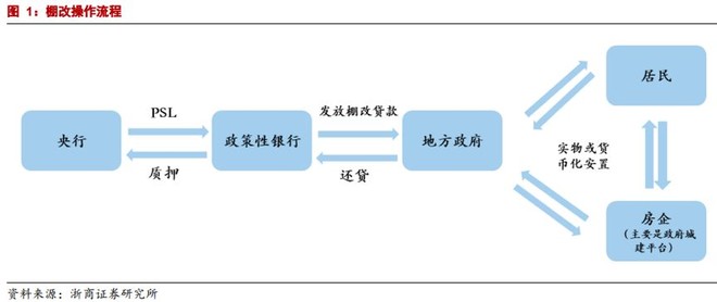 目前,棚改貨幣化支付的資金來源主要是財政撥款和政策性銀行(如國開行、農發行)貸款,其中政府以土地為抵押向政策性銀行貸款是主要獲得棚改資金的方式。根據浙商證券的研報,具體流程如下: