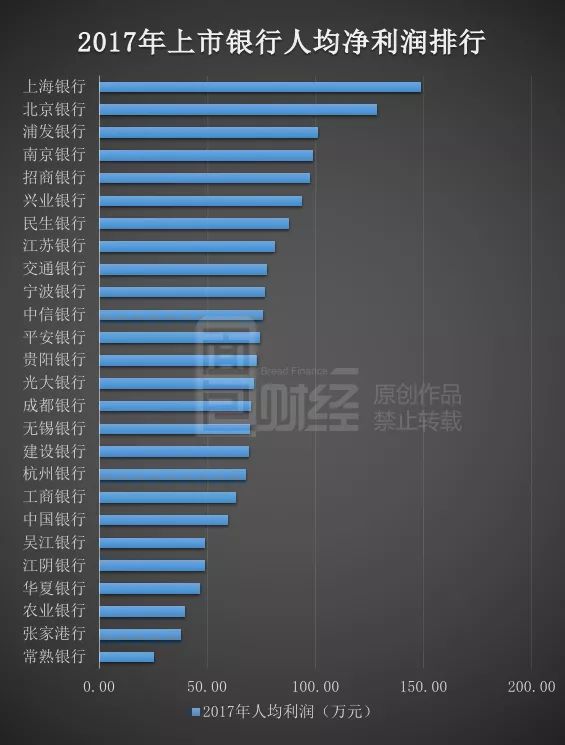 上市銀行的人均績效水平差異在擴大,總部位于經濟發(fā)達地區(qū)的城商行和股份制銀行人均創(chuàng)利能力更強。上海銀行2017年人均凈利潤148.83萬元,較2016年的137.15萬元,增長了8.52%,蟬聯上市銀行人均創(chuàng)利榜首位。下表為面包財經根據財報數據測算的A股上市銀行人均利潤榜單: