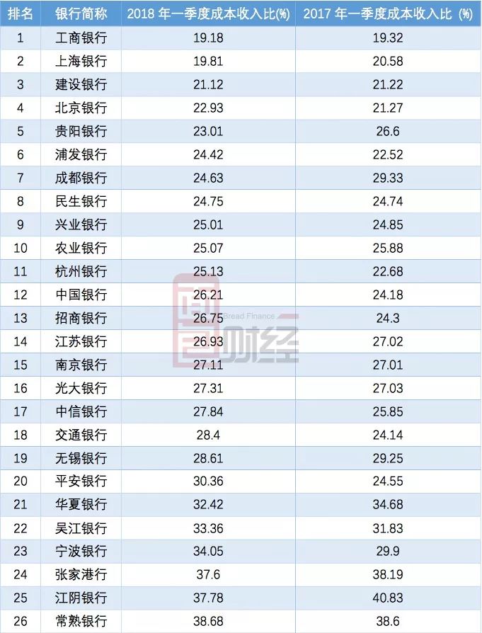 進入2018年第一個季度,A股26家上市銀行的成本收入比整體仍在攀升,具體如下表: