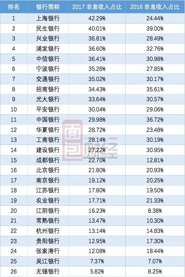 統(tǒng)計數據顯示:四大行的非利息收入占比普遍下降,而城商行非息收入占比普遍上升,股份制銀行則有升有降。