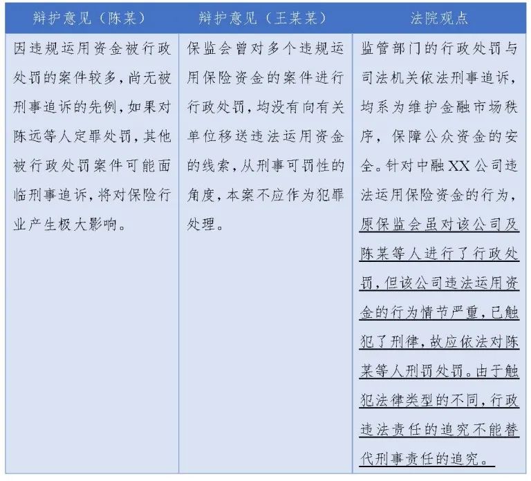 此外,在“胡某某等案”中,辯護人提出了行政違法性能夠成為阻卻刑事犯罪的理由,即如果被告單位已經受到到銀保監(jiān)會的行政處罰就不應再受到刑事處罰的觀點,而法院認為不存在經過行政處罰就不能受刑事處罰的相關規(guī)定,兩者法律類型不同,行政違法責任的處罰不能替代刑事責任。