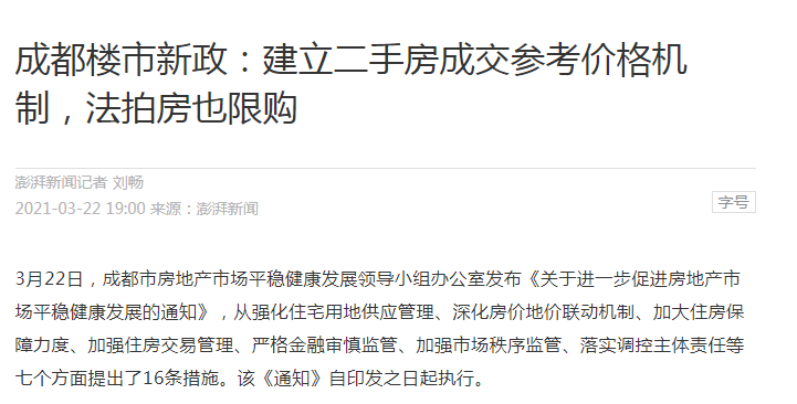 3月22日,成都市房地產(chǎn)市場平穩(wěn)健康發(fā)展領(lǐng)導(dǎo)小組辦公室發(fā)布《關(guān)于進一步促進房地產(chǎn)市場平穩(wěn)健康發(fā)展的通知》,其中提到了建立二手房成交參考價格機制,并將法拍房也納入限購范疇。