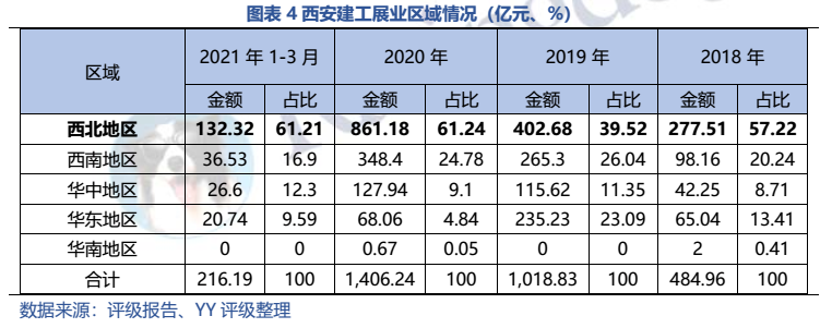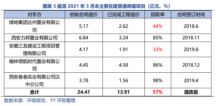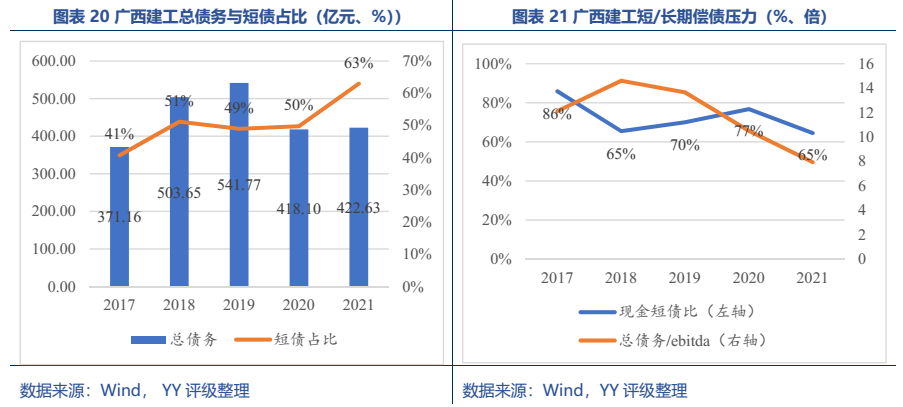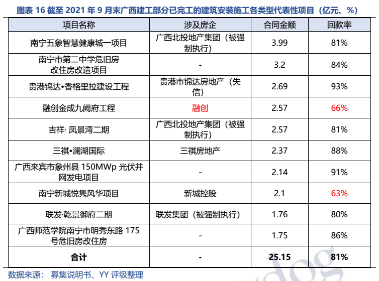梳理分析下來,可知西安建工混改完成后新簽合同大幅增加,同時,房建占比提升,展業區域由西安市內拓展至西北區域;對綠地風險敞口51億元,其他對手方以民營房企和弱國企為主,資質較弱;綠地展期后,暫無前臺成交,預計后續隱含將明顯弱化。廣西建工混改完成后業務變化不大,仍以房建為主,集中在廣西展業;與綠地資金牽連不大(或未披露),但業務對手方資質弱,以出險房企、失信民營房企和弱城投為主;在年內到期或行權債券約60億元的情況下,綠地展期后隱含急劇弱化,YY隱含飆升至20以上。