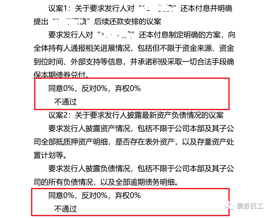 根據(jù)某債券發(fā)行人2022年2月14日的公告信息,公司召開的持有人會(huì)議需要表決的兩個(gè)議案,兩項(xiàng)表決均是債券持有人同意0%,反對(duì)0%,棄權(quán)0%,實(shí)現(xiàn)了債券持有人的零參與。雖然這個(gè)發(fā)行人已經(jīng)債券違約了,但是債券持有人會(huì)議還是要重視的,這種結(jié)果也是很少見的。