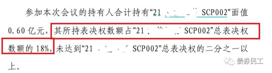持有人會(huì)議未生效的主要原因是參會(huì)的持有人數(shù)不夠,注意是參會(huì)人數(shù)未達(dá)到約定的標(biāo)準(zhǔn),不是投反對(duì)票的人數(shù)。但是也真沒想到,部分債券持有人會(huì)議的參會(huì)比例會(huì)是如此之低。讓我們一起來看幾個(gè)近期未生效的債券持有人會(huì)議案例: