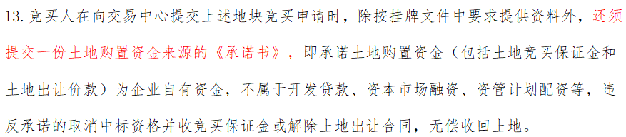 根據目前的招拍掛政策,大部分地區的國土、自然資源等部門都會在招拍掛公告中明確要求競買人必須承諾保證金和土地出讓價款為自有資金,其中個別地區的國土部門還會穿透核查競拍主體的資金來源: