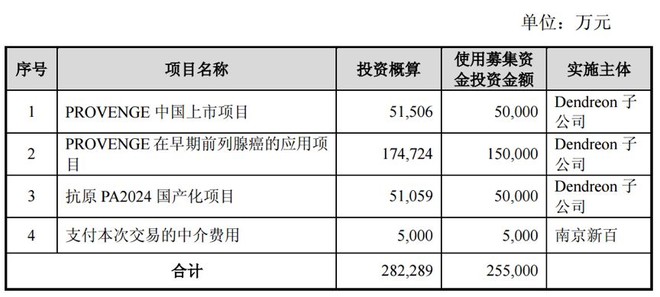 根據(jù)南京新百的收購方案,公司擬配套募資25.5億元用于Provenge在中國上市項目、Provenge在早期前列腺癌的應用項目、抗原PA2024國產(chǎn)化項目的建設運營等。