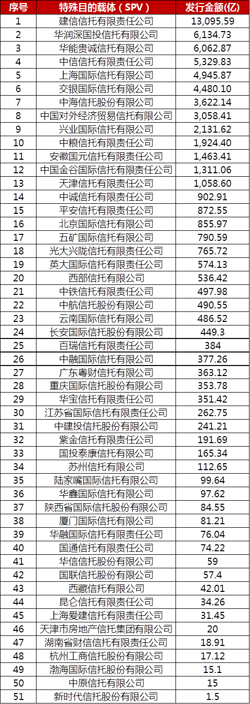 截至2021年10月9日,全市場資產證券化產品累計發行7818只,累計發行金額13.04萬億元。據不完全統計,信托公司作為特殊目的載體(SPV)角色的ABS產品合計2352只,規模合計6.55萬億元,其中排名前五的信托公司為建信信托、華潤深國投信托、華能貴誠信托、中信信托和上海信托,分別為1.31萬億元、6135億元、6063億元、5330億元和4946億元,具體參見圖表1。