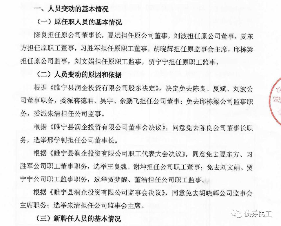 1、2022年1月18日,睢寧縣潤企投資有限公司發布公告,公司的董事長、監事會主席以及部分董事、部分監事進行了變更。