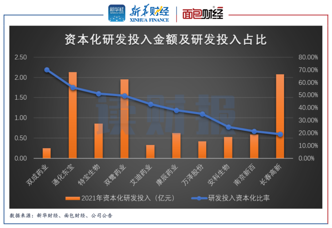 但另一方面,通化東寶研發(fā)投入資本化比例明顯較高。數(shù)據(jù)顯示,公司2021年合計3.80億元的研發(fā)投入中,資本化的金額為2.13億元,占比達56.11%。