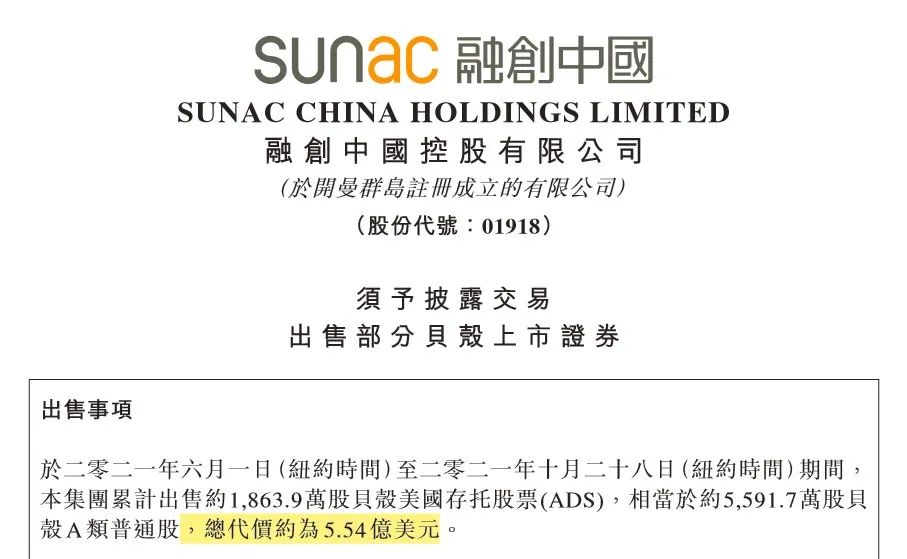 融創(chuàng)的“輸血”動作還不止于此,更早的10月底,融創(chuàng)中國公告披露,于今年6月1日(紐約時間)至10月28日(紐約時間)期間,累計出售約1863.9萬股貝殼美國存托股票(ADS),相當(dāng)于約5591.7萬股貝殼A類普通股,總代價約為5.54億美元,折合人民幣約為35.4億元。