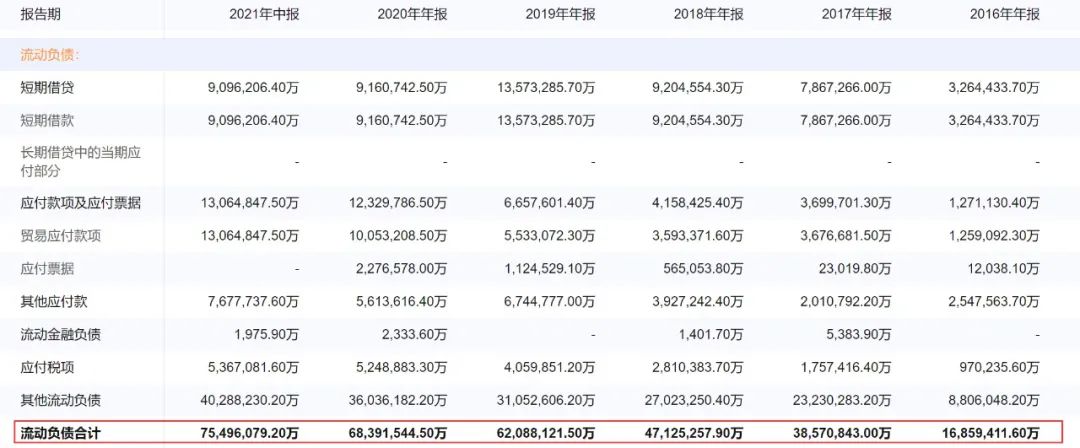 順便杠桿地產(chǎn)也看了下恒大同期的流動負債,2021中期約為1.57萬億元,2020末期約為1.51萬億元。