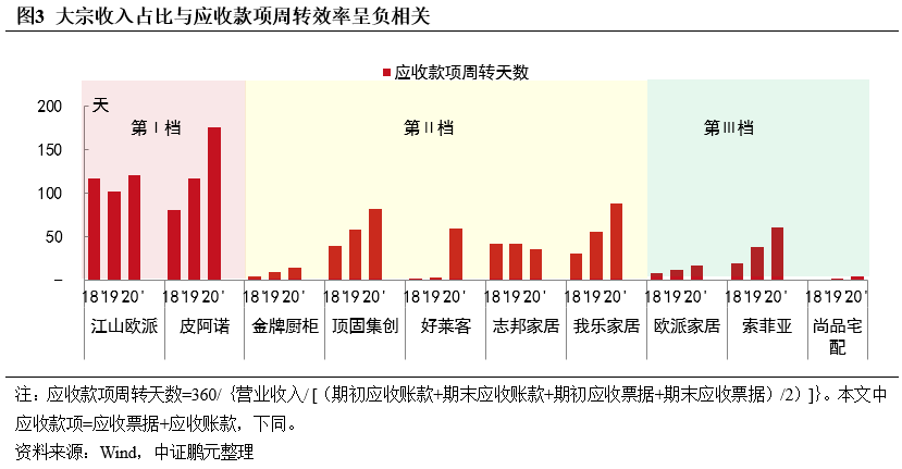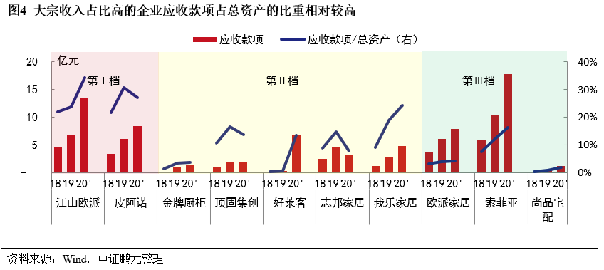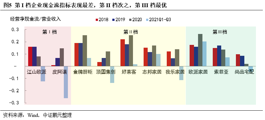 大宗業(yè)務(wù)占比高或大宗客戶(hù)風(fēng)險(xiǎn)大的樣本企業(yè)經(jīng)營(yíng)現(xiàn)金流弱化。2021年下半年以來(lái)房企流動(dòng)性緊張,直接影響定制家居企業(yè)回款。江山歐派和皮阿諾經(jīng)營(yíng)現(xiàn)金流指標(biāo)在2021年1-9月出現(xiàn)明顯的下滑,頂固集創(chuàng)由于積極推進(jìn)大宗業(yè)務(wù),業(yè)務(wù)合作保證金支出較大拖累經(jīng)營(yíng)現(xiàn)金流,我樂(lè)家居2021年半年報(bào)顯示其應(yīng)收賬款前五大均為恒大地產(chǎn)、華夏幸福及金科地產(chǎn)的關(guān)聯(lián)企業(yè)。尚品宅配不涉及大宗業(yè)務(wù),其經(jīng)營(yíng)現(xiàn)金流指標(biāo)弱化則是由于戰(zhàn)略調(diào)整,全面轉(zhuǎn)型整裝業(yè)務(wù)所致。