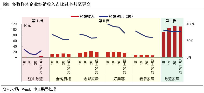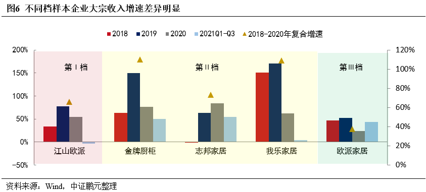 從三年復(fù)合增速看,江山歐派以大宗業(yè)務(wù)為主業(yè),其增速水平仍然不低,金牌廚柜、志邦家居、我樂(lè)家居均保持了70%以上的增速,歐派家居增速最低。從2021年前三季度大宗業(yè)務(wù)增速來(lái)看,三檔企業(yè)分化更加明顯。歐派家居仍保持增長(zhǎng),江山歐派已出現(xiàn)負(fù)增長(zhǎng),第II檔的我樂(lè)家居增速也受到重創(chuàng)。金牌廚柜和志邦家居增速受影響較小,主要是金牌廚柜的代理模式占比高,志邦家居調(diào)整客戶(hù)結(jié)構(gòu)后恒大等高負(fù)債客戶(hù)合作量大幅下降所致。