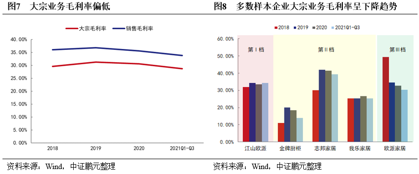 大宗業(yè)務(wù)“量大利薄”,其增速放緩對(duì)第I、II檔企業(yè)及中小規(guī)模企業(yè)影響較大,未來(lái)競(jìng)爭(zhēng)加劇,其盈利空間將持續(xù)被壓縮。大宗業(yè)務(wù)經(jīng)歷2018-2019年的快速增長(zhǎng),2020年受疫情、地產(chǎn)調(diào)控等影響增速放緩,2021年以來(lái)地產(chǎn)調(diào)控升級(jí),房企資金壓力上升,雖然企業(yè)積極拓展同優(yōu)質(zhì)房企的合作,卻未能阻止大宗業(yè)務(wù)增速下滑。2021年三季度江山歐派、我樂(lè)家居的大宗業(yè)務(wù)分別同比下降24.11%和14.62%。