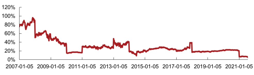 7月相對恒指PB周均值為25.7% ,低于上月的周均值31.3%,低于2020年全年相對恒指PB周均值75.7%??硕饍确抗深I先指數成分股7月整體PB周均值為0.94,低于上月周均值1.04,低于2020年全年PB周均值1.30。