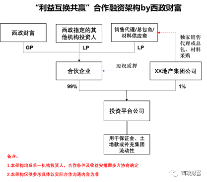 西政作為GP與總包商/材料供應(yīng)商/房產(chǎn)銷售代理商以及其他機構(gòu)投資人共同成立合伙企業(yè)。